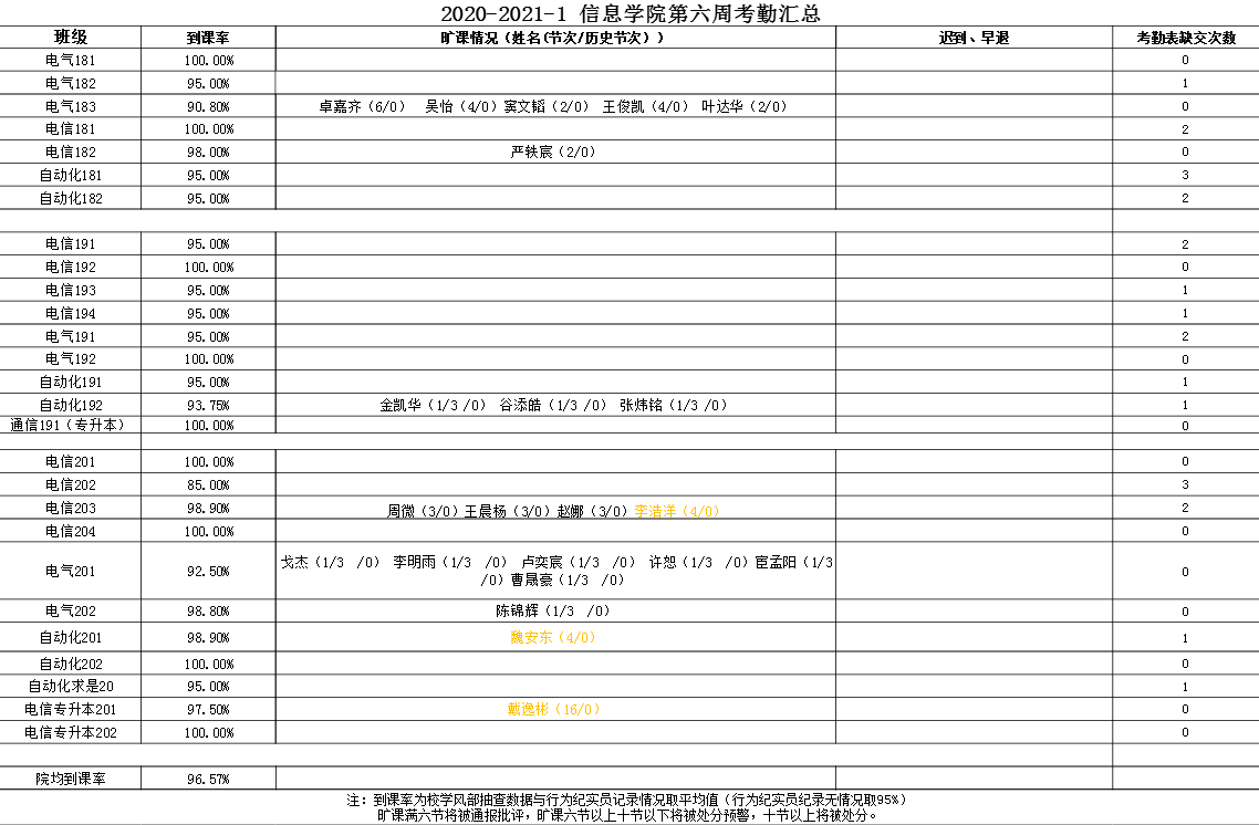 根据班级行为纪实员上报、学院学风部自查、学校学风部抽查结果,现将本学期第六周学风考勤情况予以公示,旷课的同学请及时核对情况,如有请假等原因请在公示期内说明,否则按照旷课处理;到课率低的班级请严格要求,加强班级管理,加强学风建设。