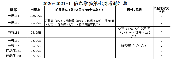 根据班级行为纪实员上报、学院学风部自查、学校学风部抽查结果,现将本学期第七周学风考勤情况予以公示,旷课的同学请及时核对情况,如有请假等原因请在公示期内说明,否则按照旷课处理;到课率低的班级请严格要求,加强班级管理,加强学风建设。