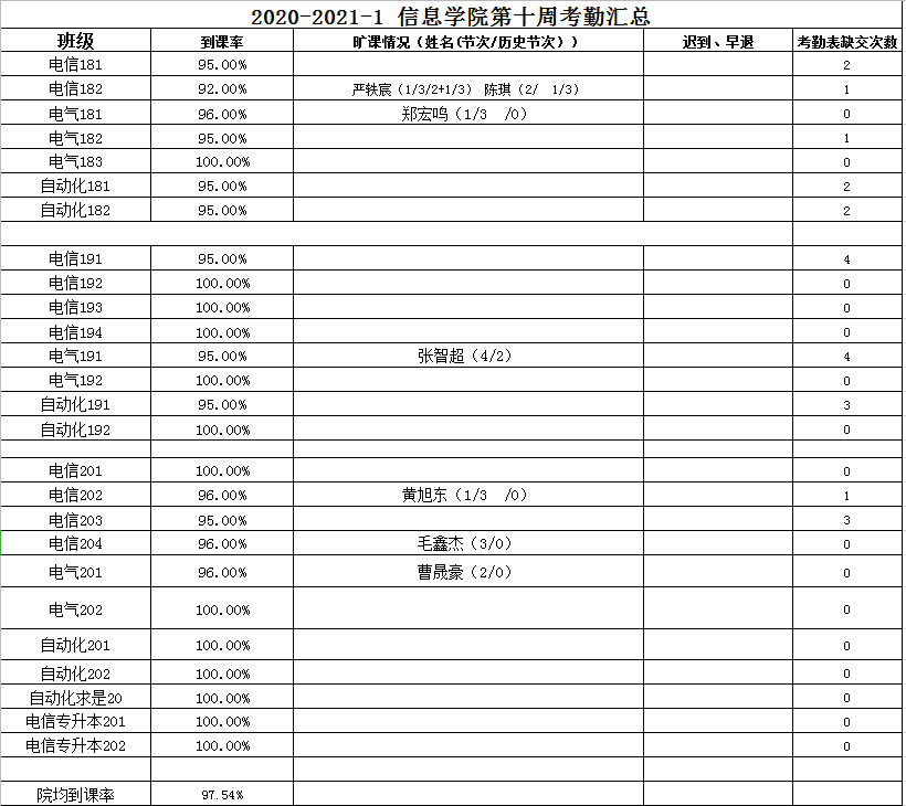 根据班级行为纪实员上报、学院学风部自查、学校学风部抽查结果,现将本学期第九周学风考勤情况予以公示,旷课的同学请及时核对情况,如有请假等原因请在公示期内说明,否则按照旷课处理;到课率低的班级请严格要求,加强班级管理,加强学风建设。