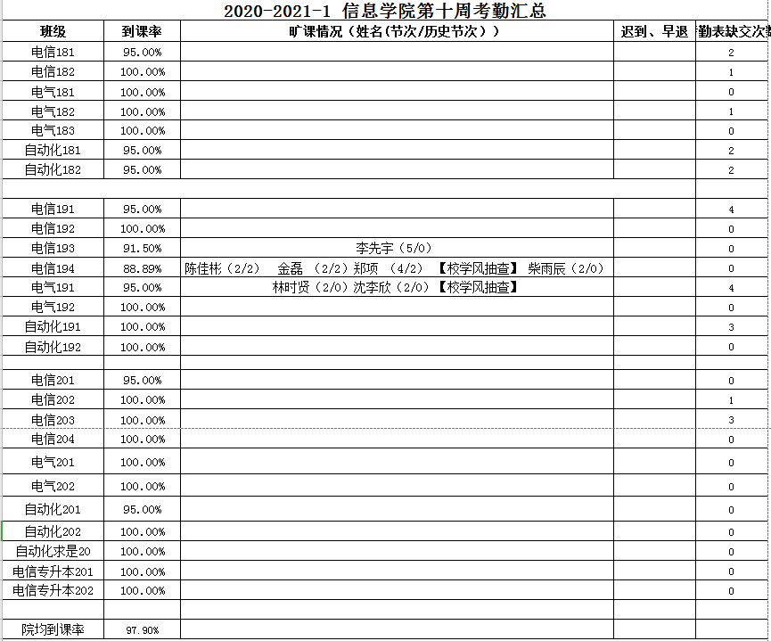 根据班级行为纪实员上报、学院学风部自查、学校学风部抽查结果,现将本学期第十周学风考勤情况予以公示,旷课的同学请及时核对情况,如有请假等原因请在公示期内说明,否则按照旷课处理;到课率低的班级请严格要求,加强班级管理,加强学风建设。