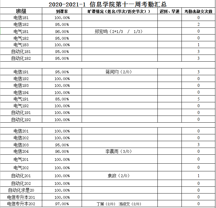 根据班级行为纪实员上报、学院学风部自查、学校学风部抽查结果,现将本学期第11周学风考勤情况予以公示,旷课的同学请及时核对情况,如有请假等原因请在公示期内说明,否则按照旷课处理;到课率低的班级请严格要求,加强班级管理,加强学风建设。
