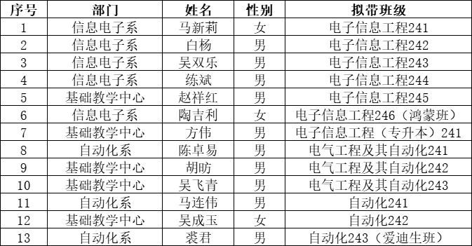 为做好2024级新生班级的管理和教育工作,充分发挥专业教师的育人作用,根据学校相关文件规定,经教师个人申请、系所推荐、学院统筹,现确定马新莉等13名教师担任信息学院2024级新生班导师,现将名单公布如下: