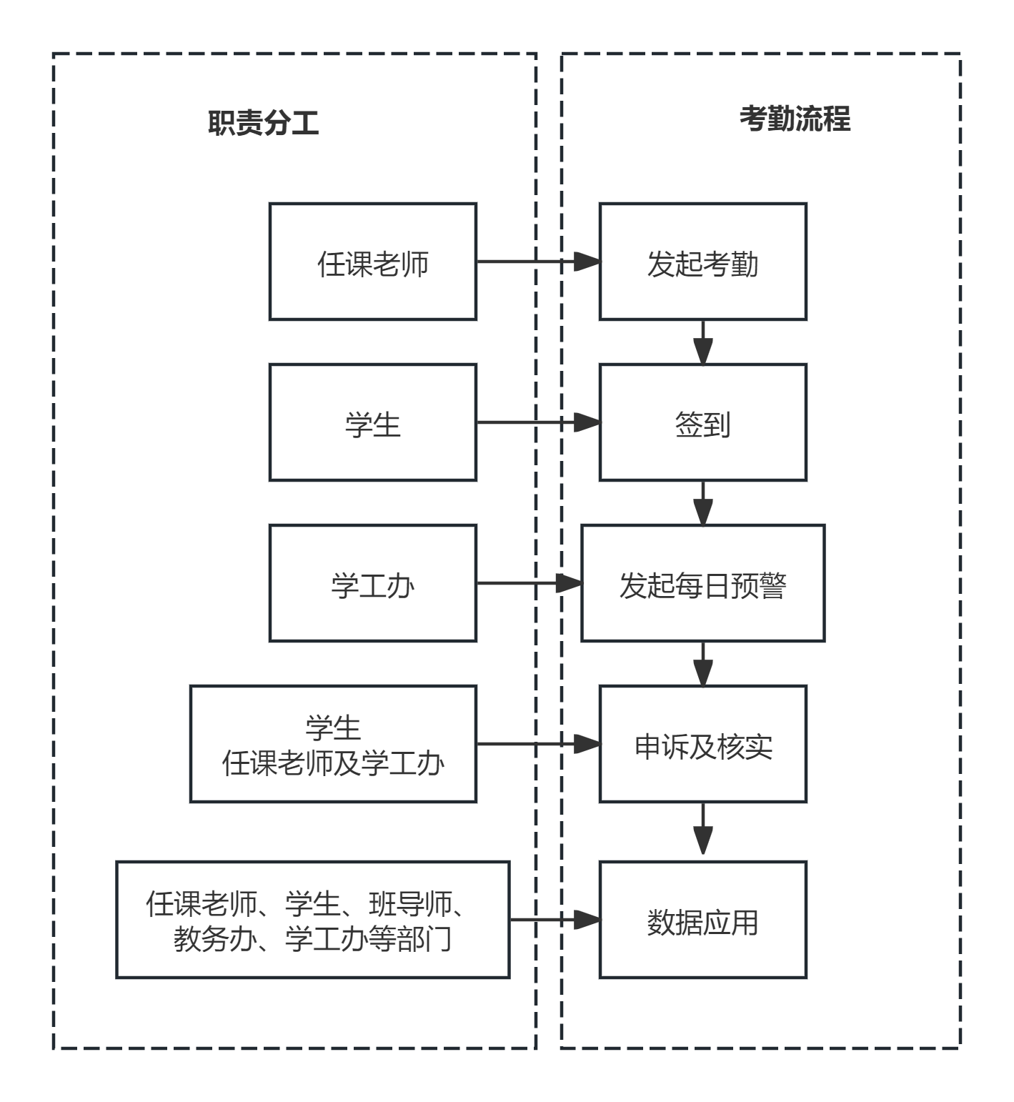 5.学工办:负责考勤数据对接、汇总及分析,建立学生缺勤台账,并同步给班导师、系;